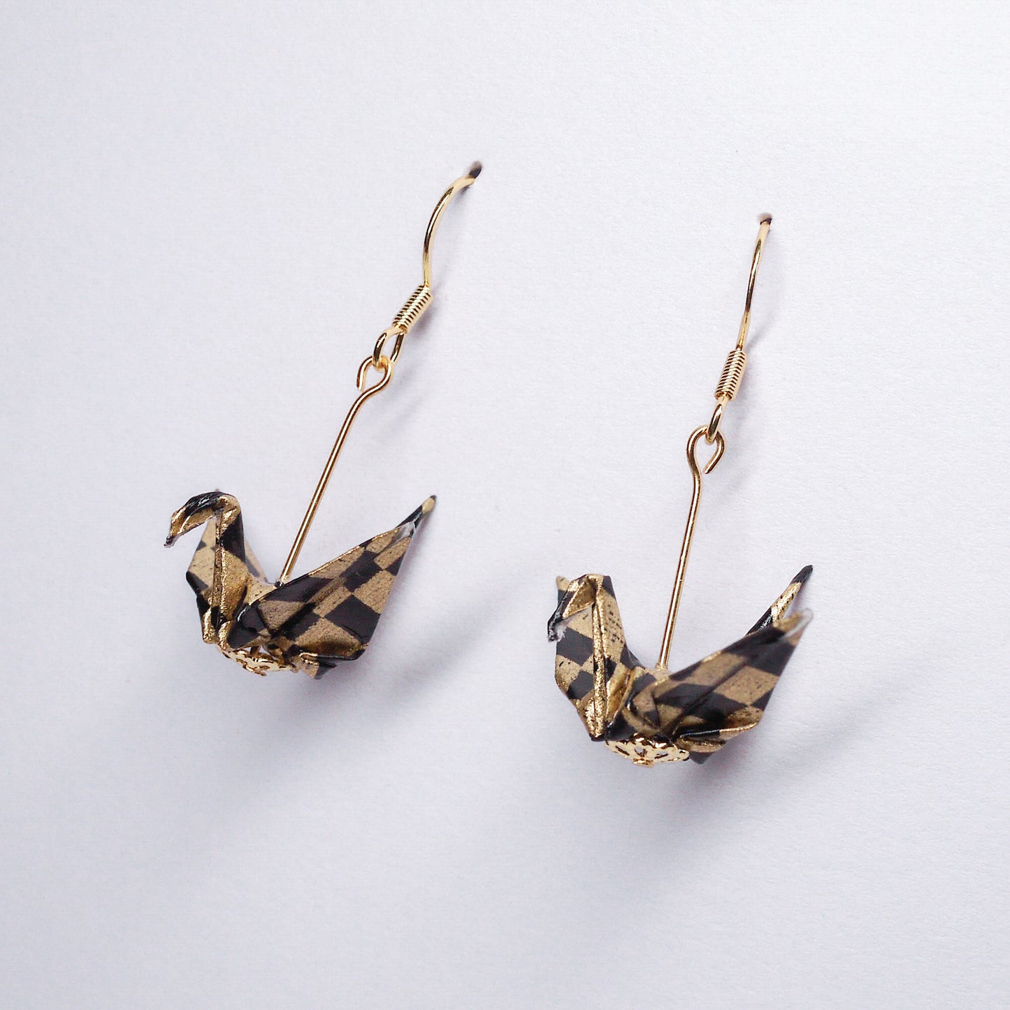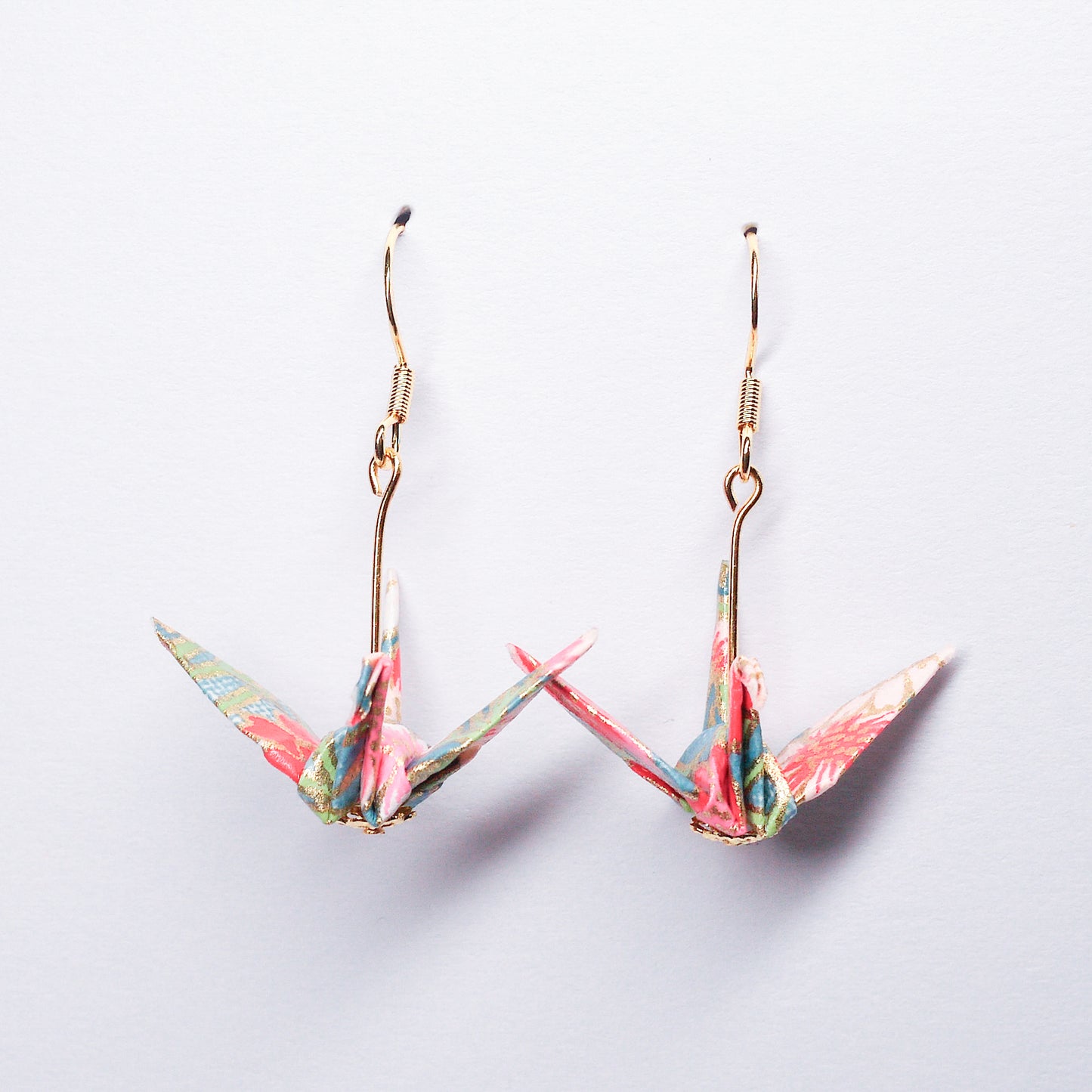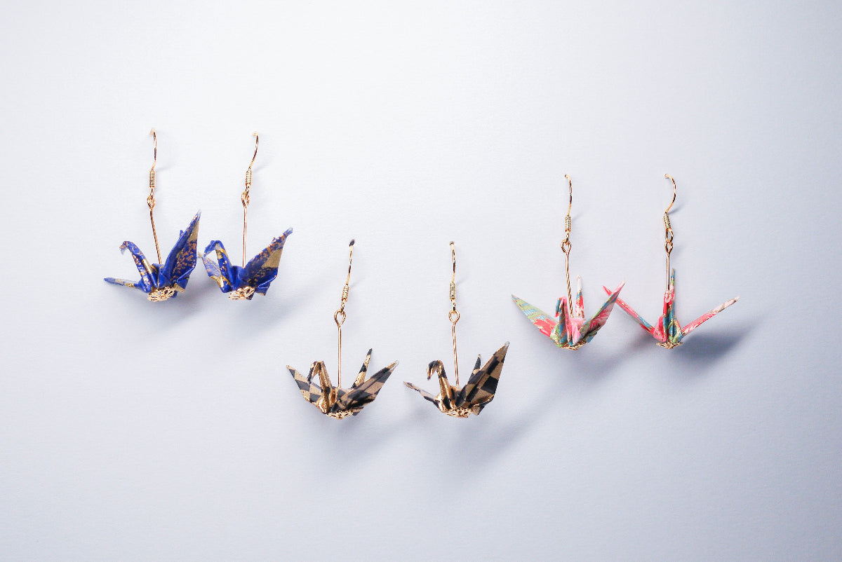These statement earrings feature origami cranes made from traditional Japanese washi paper. Each crane is hand-folded and sealed with a water-resistant glaze for durability while keeping its delicate paper quality.