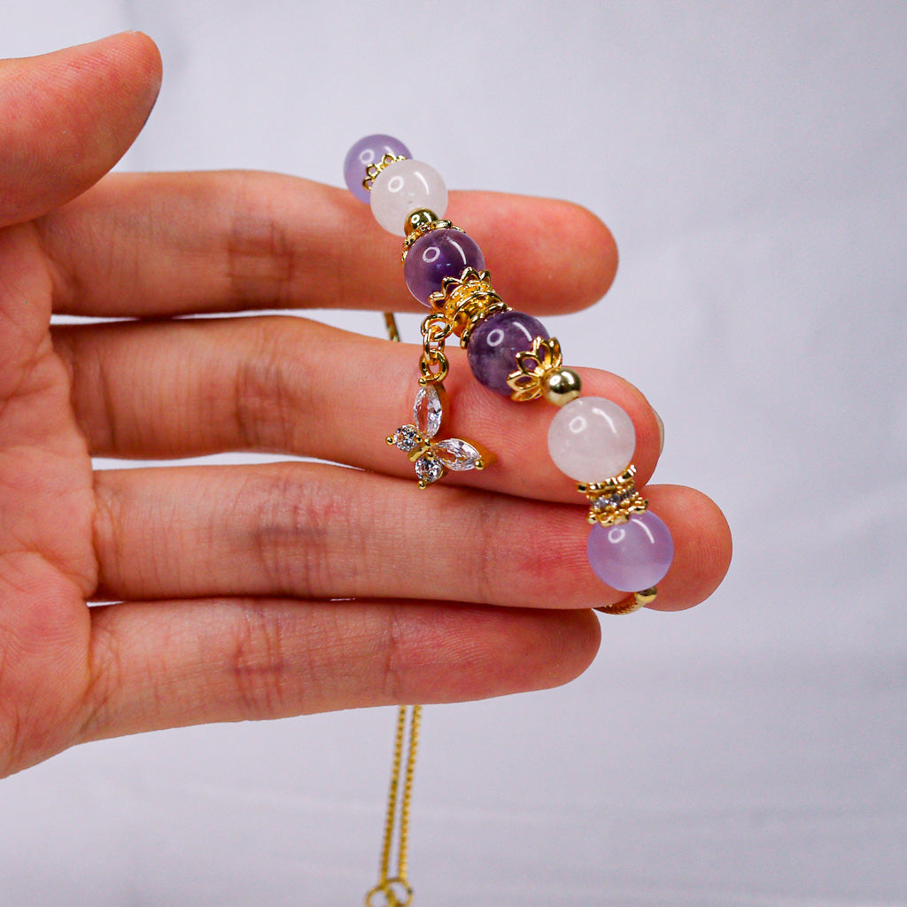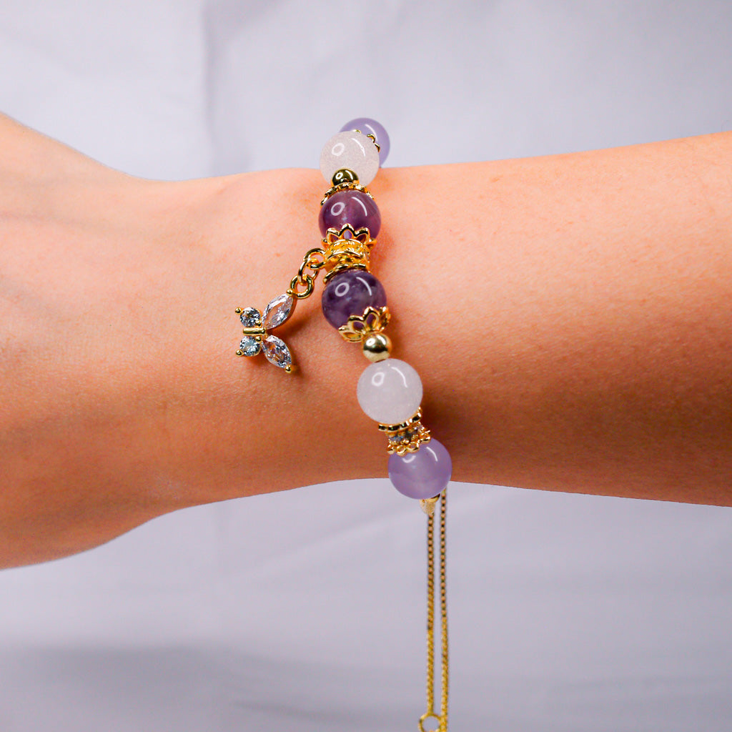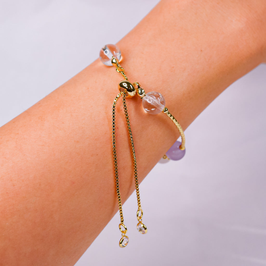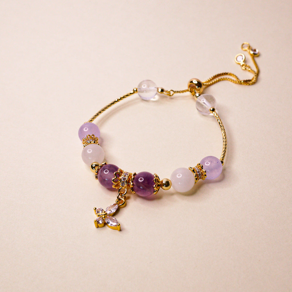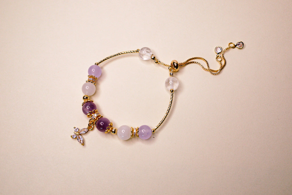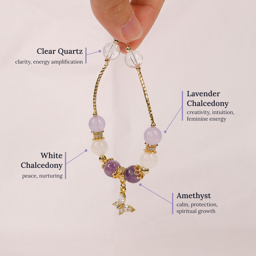 This dreamy bracelet blends soft lavender and clear stones and centers around a zirconia butterfly charm in an adjustable gold setting that's both calming and elegant. The mix of amethyst, clear quartz, and chalcedony creates beautiful color variation that brings together clarity and calm - perfect for when you need to stay centered but creative.
