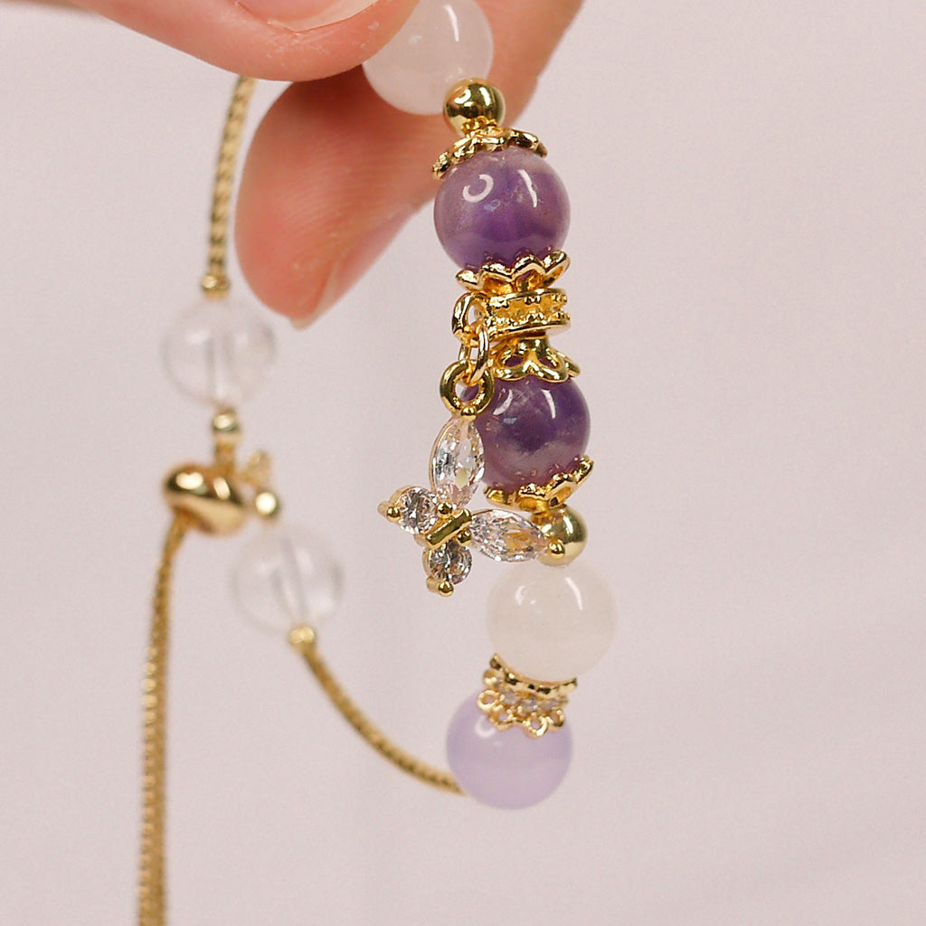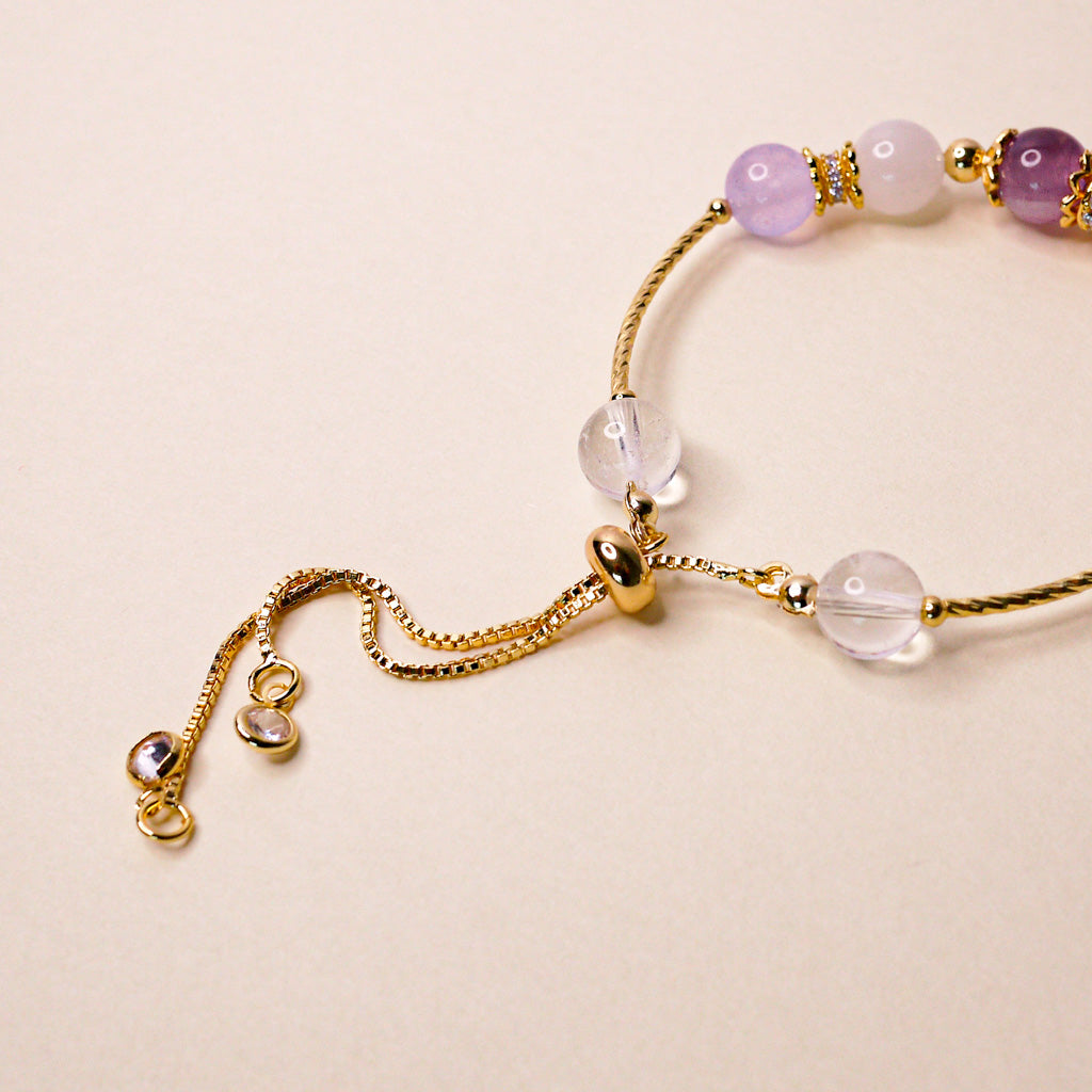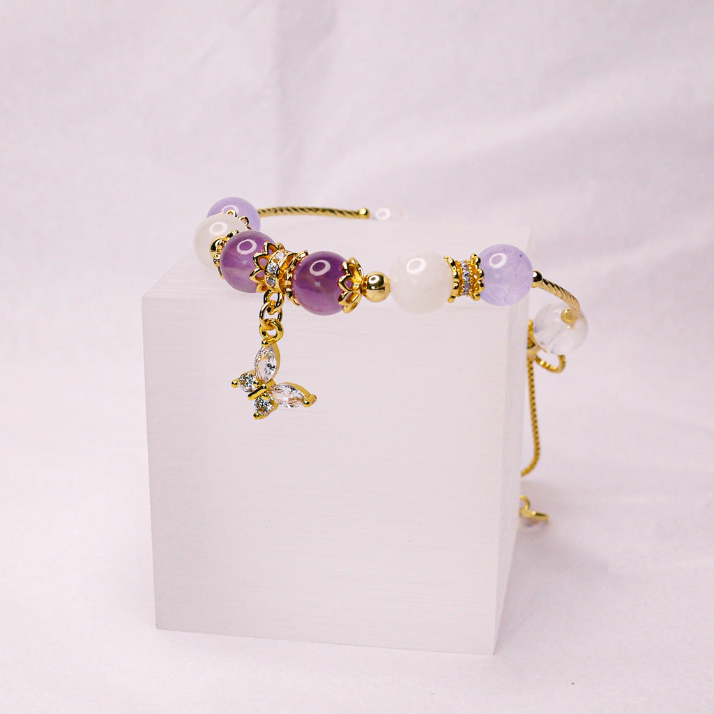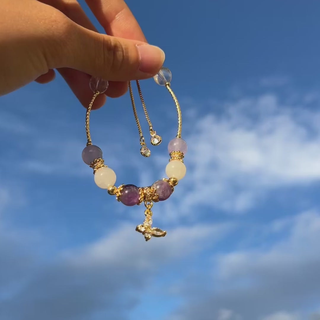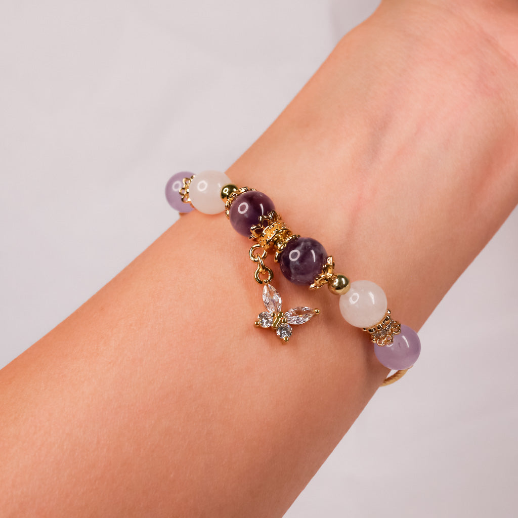 This dreamy bracelet blends soft lavender and clear stones and centers around a zirconia butterfly charm in an adjustable gold setting that's both calming and elegant. The mix of amethyst, clear quartz, and chalcedony creates beautiful color variation that brings together clarity and calm - perfect for when you need to stay centered but creative.