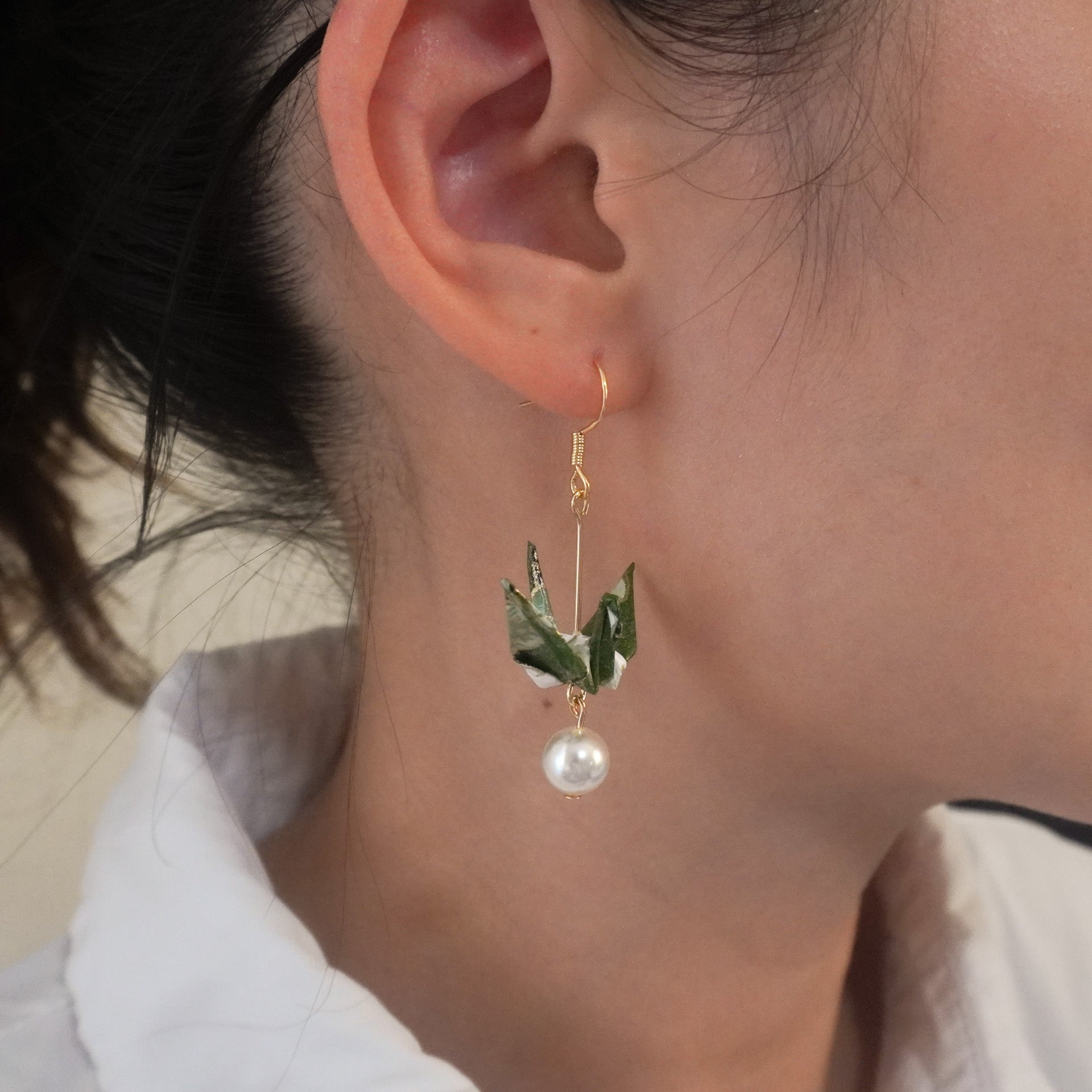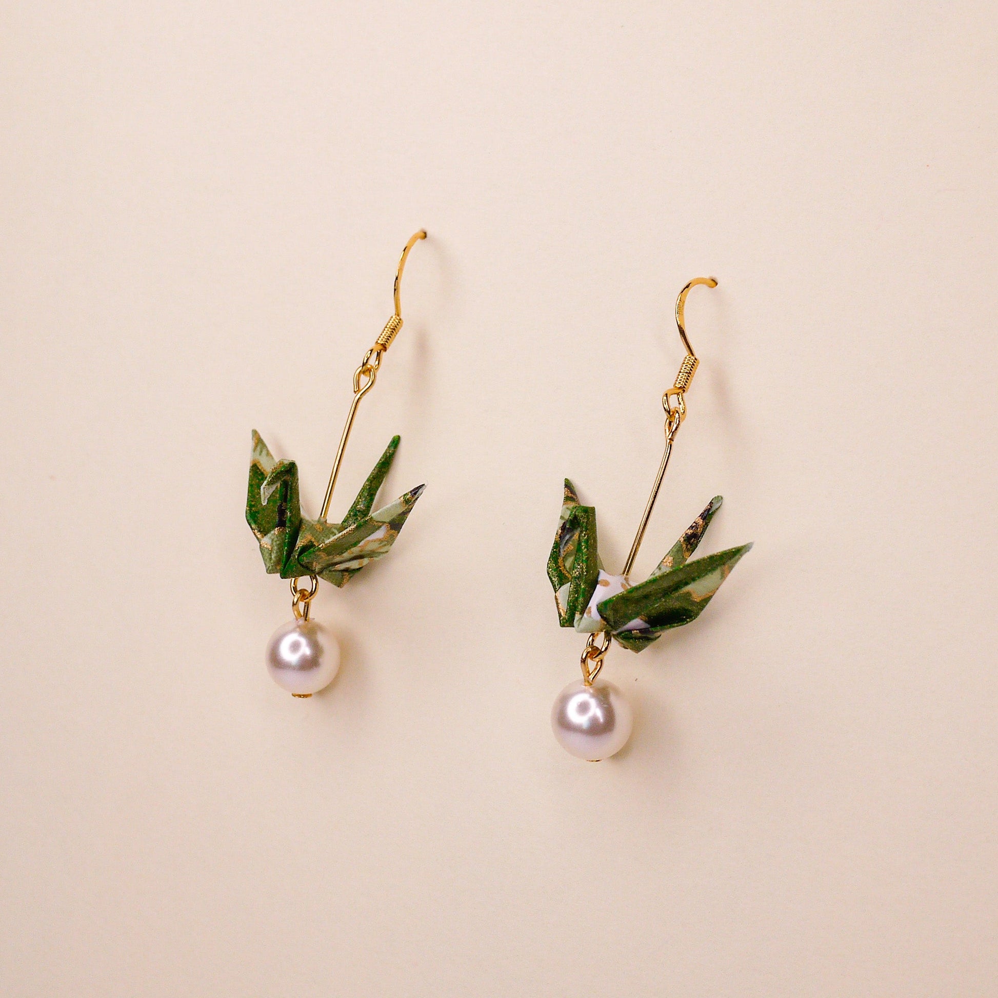 These earrings celebrate health with green origami cranes and pearl drops. Green is often linked to nature and vitality, while pearls bring a calm feel. This design brings those ideas together in a clean, elegant way. Each crane is hand-folded from Japanese washi paper, sealed for durability, and paired with a faux pearl.