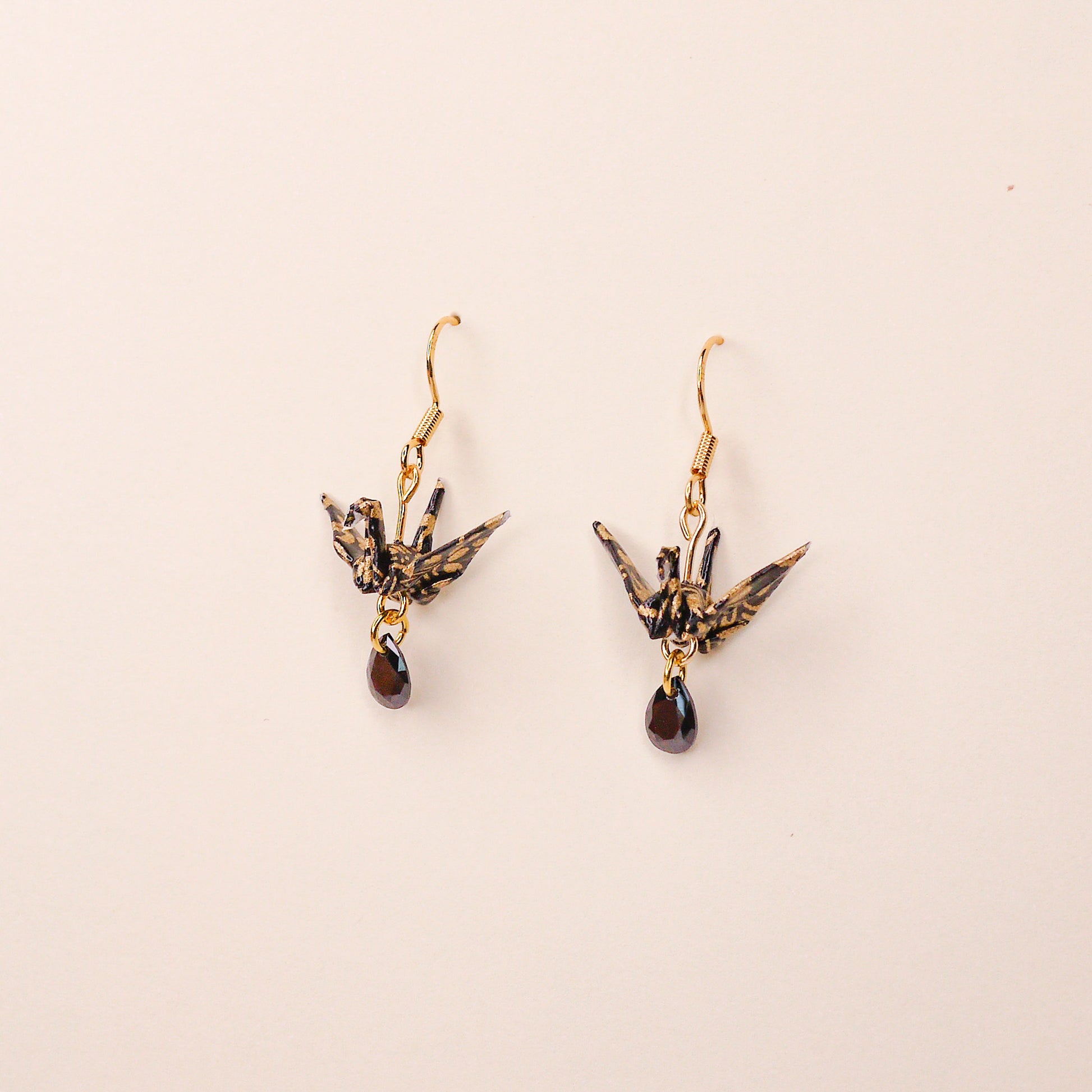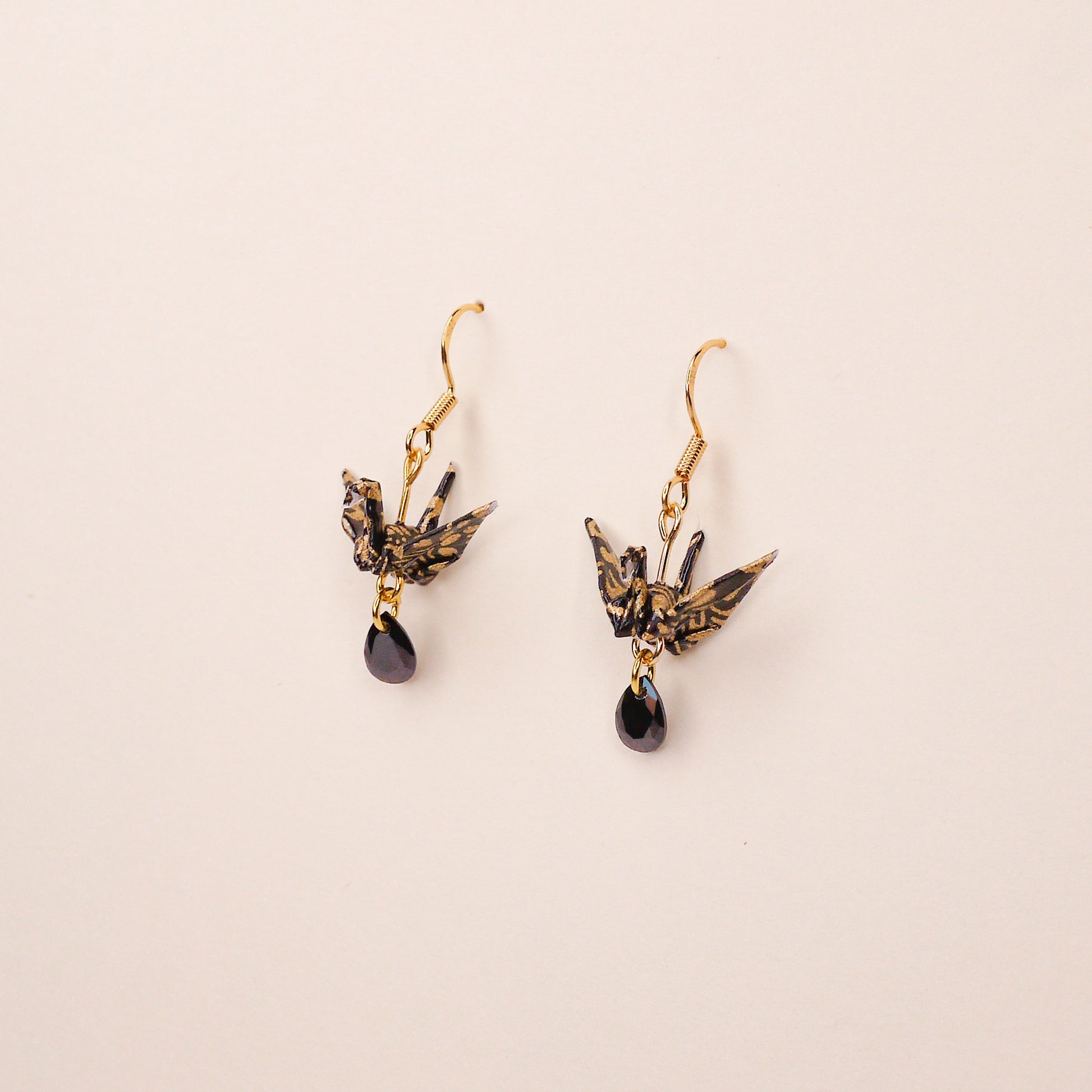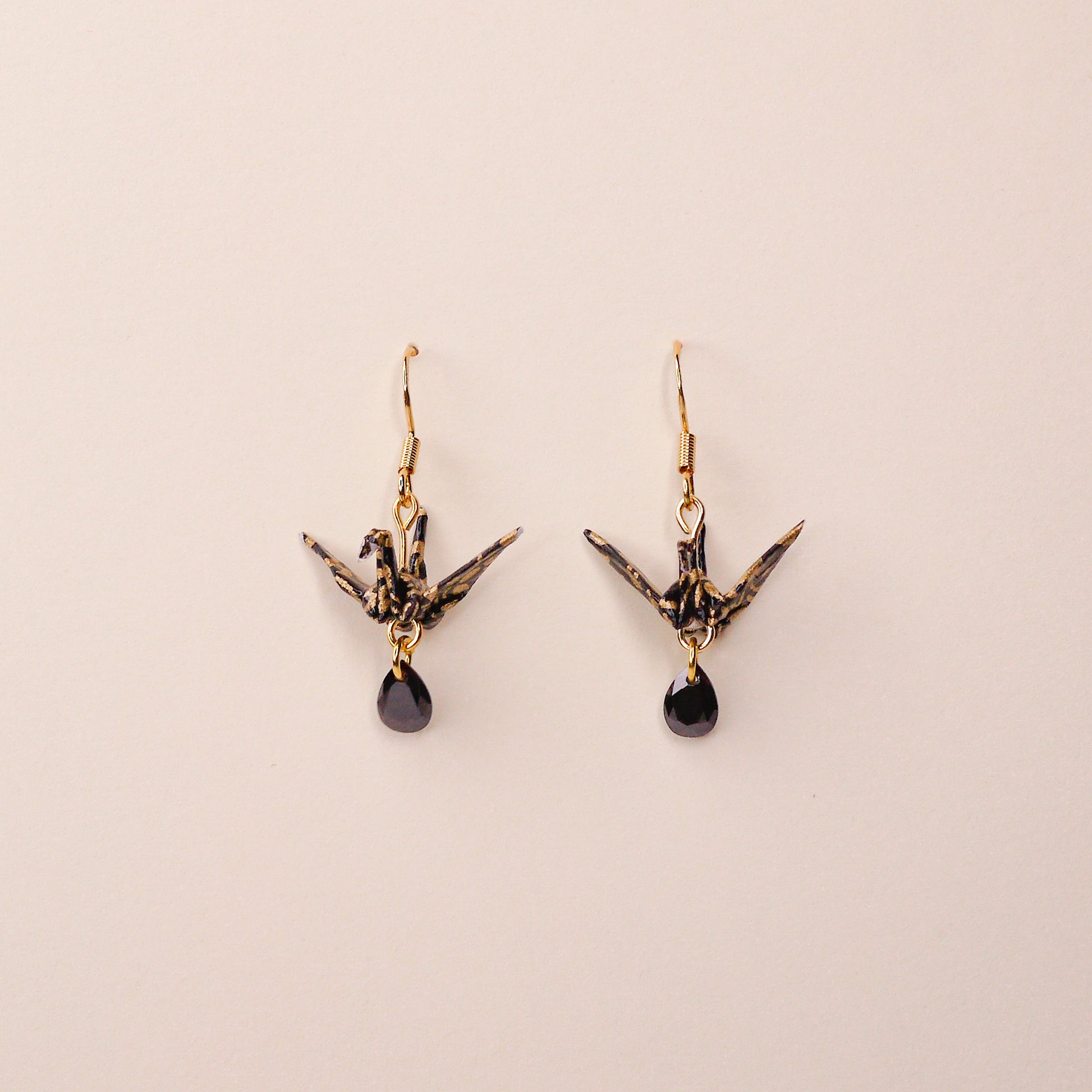 This design celebrates success with black and gold origami cranes and black zirconia stones. Black symbolizes strength and confidence, while gold evokes achievement and ambition. Designed to feel powerful and gender-inclusive, this striking pair brings a bold, sharp edge to any outfit. Each crane is hand-folded from washi paper and sealed for lasting durability.